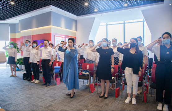 俯瞰壮阔长江,远观数桥通连,党日活动从这里开启。公司经理刘丹丽带领全体党员宣誓。