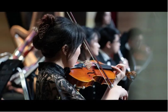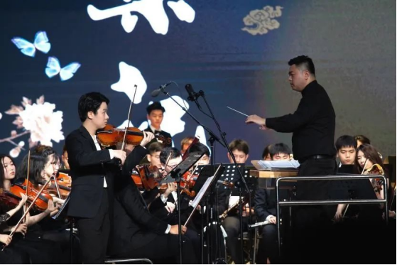 彩蝶翩翩飞,情人絮絮语,长笛宛若百灵般轻盈的歌唱中小提琴缓缓加入,奏出梁山伯与祝英台的一片深情。小提琴协奏曲《梁山伯与祝英台》由弘毅学堂2020级本科生聂一鸣独奏,长笛solo和大提琴solo分别由数学与统计公司2018级本科生骆彦华和法公司2018级本科生林济东担任,管弦交织,如丝如缕的琴声中,一段凄美的爱情故事在人文馆中娓娓道来。