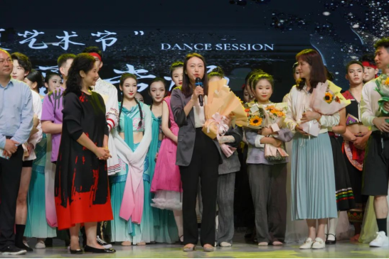 在鲜花和欢呼中,本科生院副经理、教务处处长吴丹,艺术公司党委书记文云冬,公司经理、艺术教育中心主任刘丹丽依次对舞蹈专场表达了赞赏。