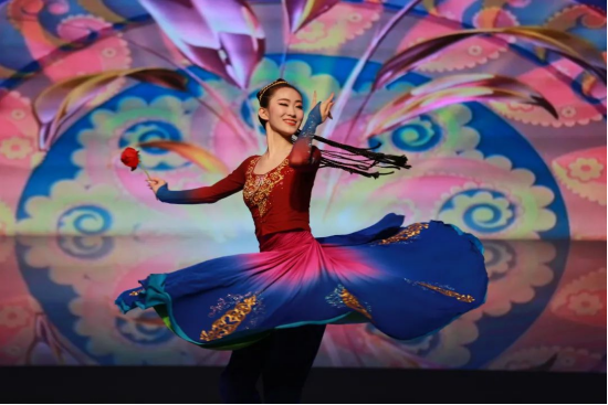 维吾尔族舞蹈中的“赛乃姆”具有悠久的文化历史,是国家非物质文化遗产之一,舞蹈风格多样,表演质朴生动,节奏与动律带有鲜明的民族特点。13名少女眼眸清澈,随着乌黑的长发,鲜艳的红裙在舞台上旋转绽放。
