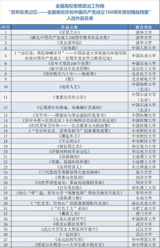 链接:关于公布“高校庆祝中国共产党成立100周年原创精品推广行动”遴选结果的通知https://www.sizhengwang.cn/a/gzdt_gsgg/211231/1004556.shtml