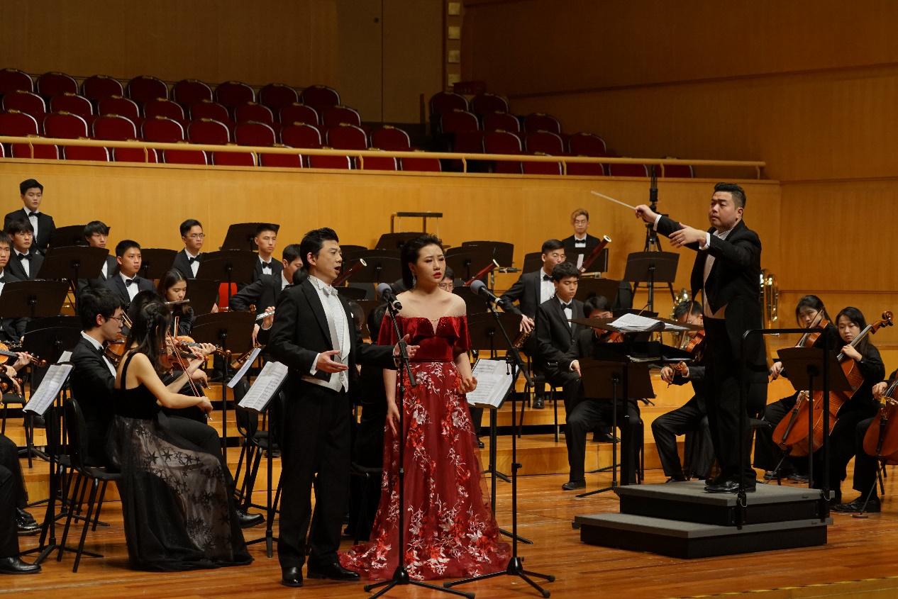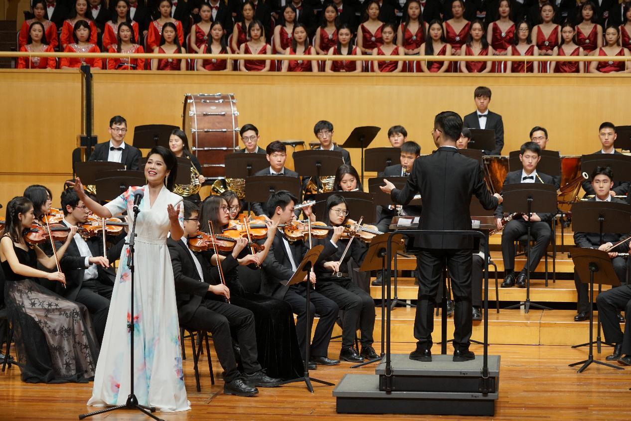 短暂的中场休息后,永利集团3044交响乐团和百人合唱团带来了抗疫歌剧《天使日记》选段:《序幕》《封城》《让我们一起看日出》。钟声敲响,时间被带回到2020的新年,一场疫情突如其来,紧凑而又庄严的旋律再次营造了封城时的肃穆,也还原了医护人员们的大爱无疆。接下来,研究生赵崔泽昊演奏的竹笛《牧民新歌》,以浓郁清新的民族民间音乐风格展现出内蒙古大草原一派生机勃勃的喜人景象。雷媛老师带来独唱《绣红旗》,具有穿透力的嗓音如泣如诉,唱出了中华民族的血脉真情。