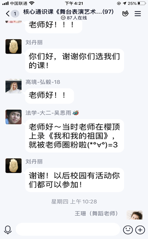 第二大类实践类专业课,由于涉及到声、台、形、表等多个训练环节,并且需要教师亲身示范以及指导练习,因而对教师的网络教学水平提出了很大挑战。表演系教师们根据教学需要,选择腾讯会议、腾讯课堂、钉钉、学习通等更具有互动性的平台,并创造性发挥才智,灵活运用各种手段探索特色教学方式。例如,《舞蹈剧目排练》课程提前录制了教师演示的形体动作小视频,供员工们在家模仿练习,员工们则通过在线发课程训练小视频的方式得到教师的反馈指导,较好解决了实践课的教学互动难题。