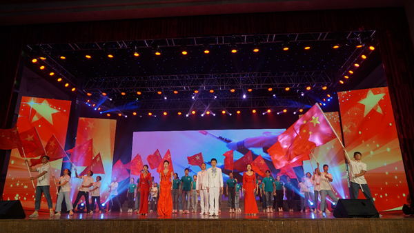 节目伊始,伴随着大屏幕上经典爱国电影的剪辑片段,老师们饱含深情地朗诵当代诗人舒婷所创作的著名爱国诗歌——《祖国啊,我亲爱的祖国》。朗诵者们情感充沛,慷慨激昂,将爱国之情溢满全场。朗诵结束后,伴随着歌舞,同学们挥舞着国旗,更是将现场氛围推向高潮。