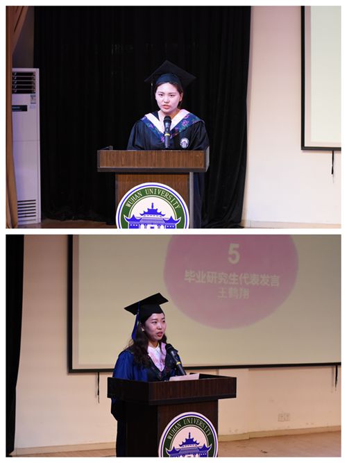 本科毕业生代表许修纯和研究生毕业生代表王鹤翔分别发言。她们难以抑制对母校、对老师、同学的不舍情怀,与此同时也表达了她们对未来的展望。